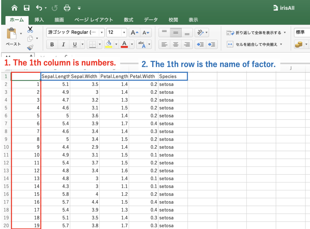 Please create the data set you wish to analyze in the tabular data format shown below in Excel or other software, and save it as a csv file for preparation.