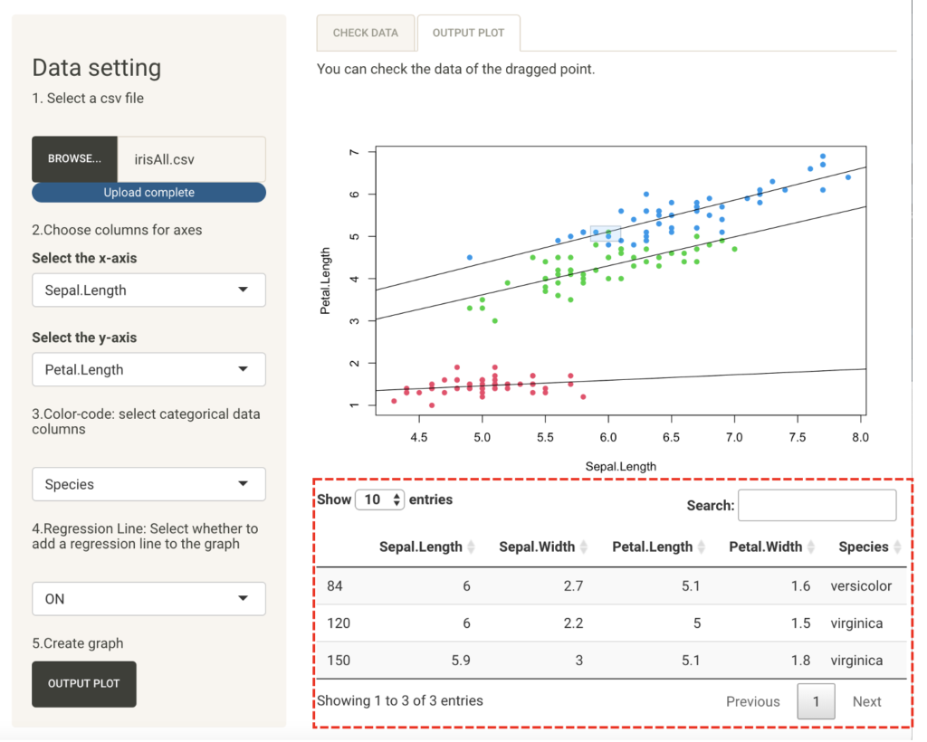 Input a csv file, set the numerical data columns to be displayed on the horizontal (x-axis) and vertical (y-axis) axes, and press the Plot Output button to output a plot on the Output tab.