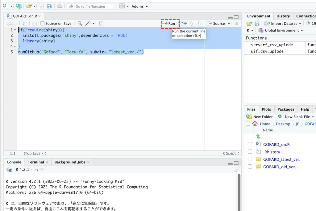 Gofard can be started from R studio by executing the following code. The following is a description of the procedure.