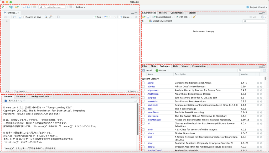 R Studioはウィンドウが4分割になっています。それぞれのウィンドウの機能は以下です。